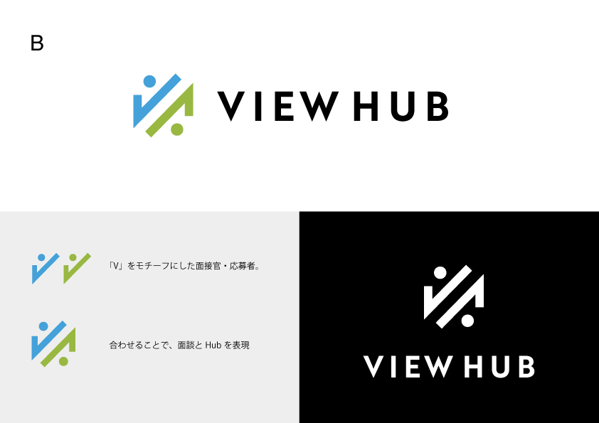 ロゴは、面接者・応募者を●で表現し、線でつなぎ、それをVの形で展開することでHubを表現。プラットフォームらしいしっかりとした雰囲気を目指しました。また、親サービスであるビデオチャットプラットフォーム FaceHubのロゴデザインを踏襲しつつ、今後の類似サービス展開に備えてロゴタイプの最適化も行なっています。 他の候補も合わせて公開いたします。