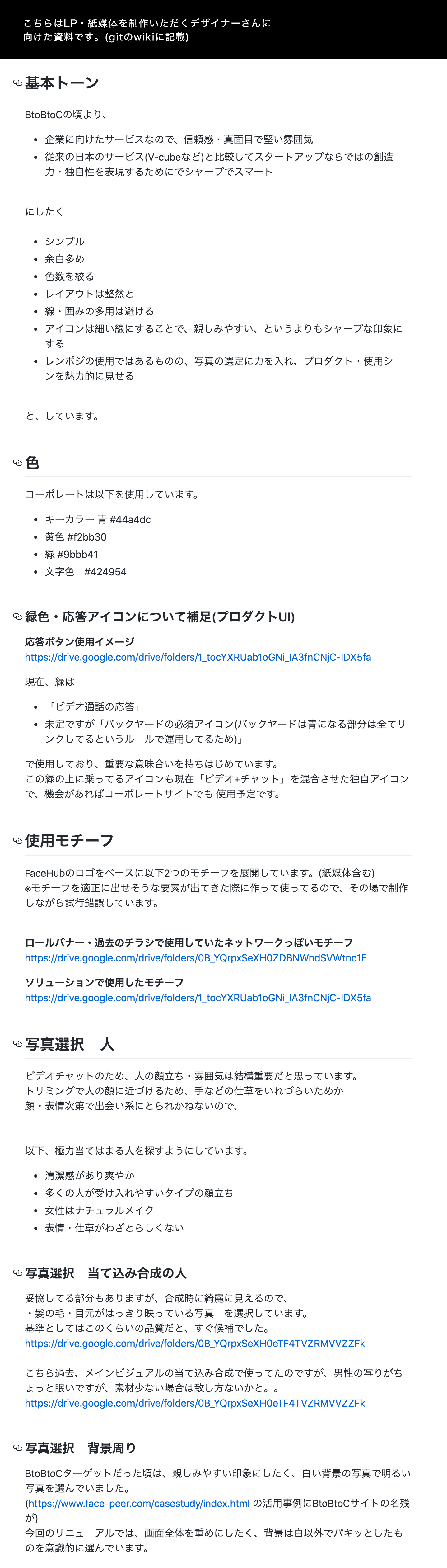 B2BtoC向けビデオチャットプラットフォームを運営するFacePeer様のデザイン周りの全面支援を行っていました。創業期から成熟期にかけて信頼性とわかりやすさのバランスを兼ね備えたUIと見た目の一貫性が全体で保てるような施策も併せて提供していました。