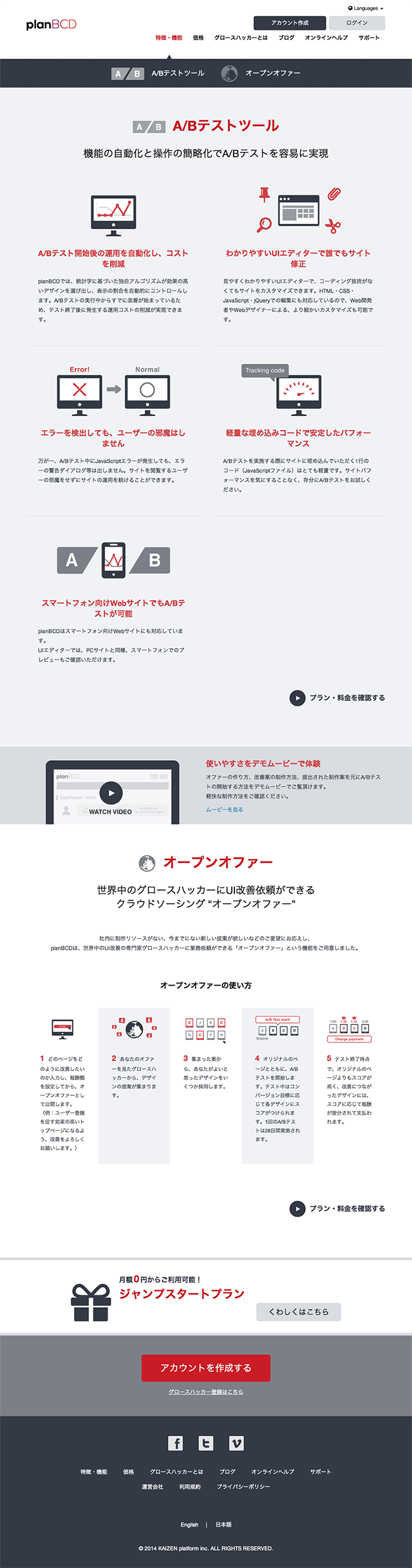 KAIZEN platform Inc.様の製品紹介サイト。 B to B らしい堅実さとStartupらしいイメージを大事に制作しています。 また、更新がしやすいようレイアウトはいくつか運用しやすいパターンを用意した上で、色の使い方などのルールをしっかり設計しています。